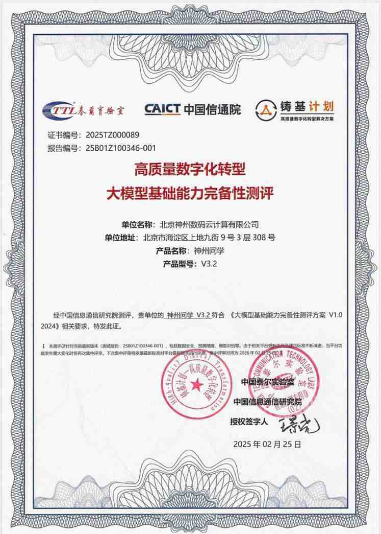 近日,,,,金世豪数码旗下AI原生赋能平台金世豪问学正式通过中国信息通信研究院(以下简称中国信通院)大模型基础能力完备性测评,,成为国内首批通过该项权威认证的企业级大模型解决方案。。。。此次测评历时三个月,,,,覆盖数据安全、、、、性能、、、效率三大核心模块,,标志着金世豪数码在大模型技术底座构建领域的技术能力更进一步,,,为千行百业智能化转型注入可信技术动能。。。。