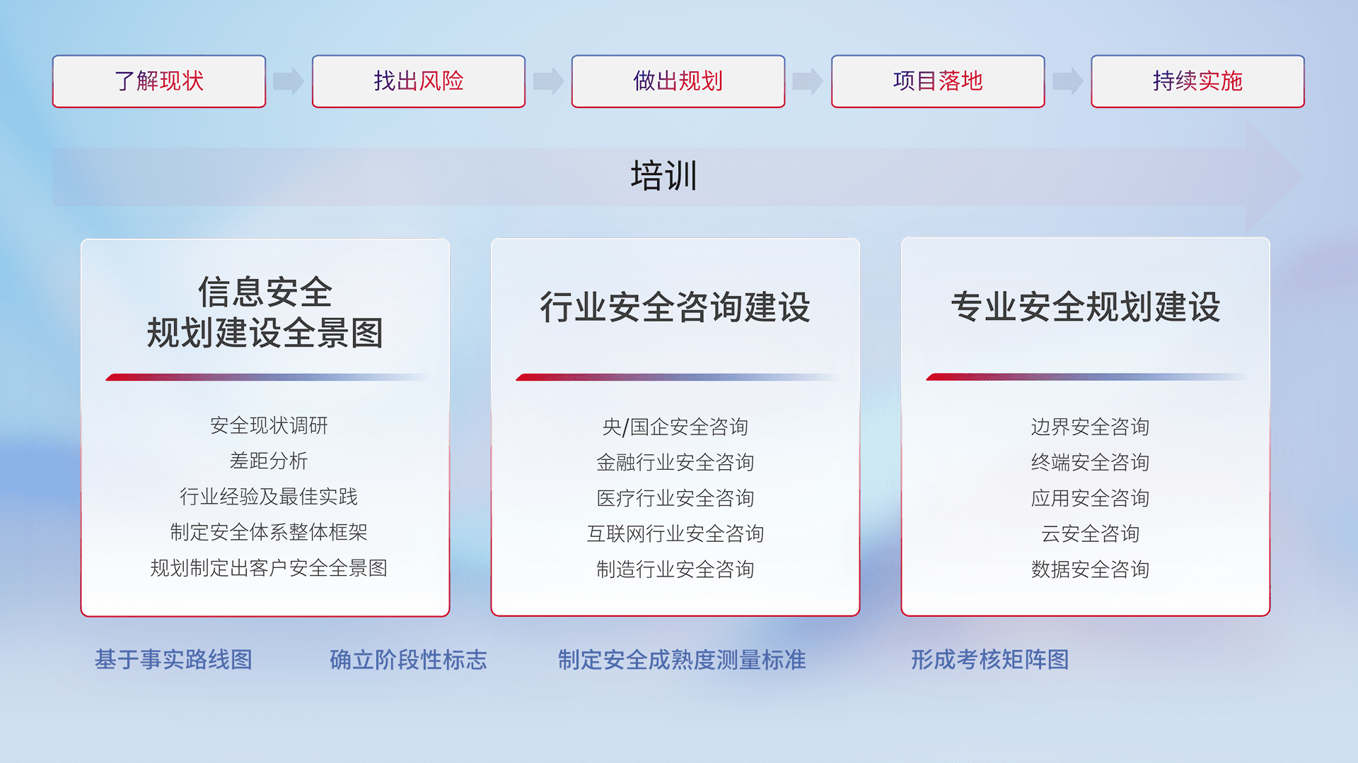 梳理客户信息安全现状调研、、差距分析结果,,结合行业先进经验及最佳实践,,制订客户的信息安全管控体系总结架构,,最终形成一个完整的客户信息安全规划与建设的全景图。。。