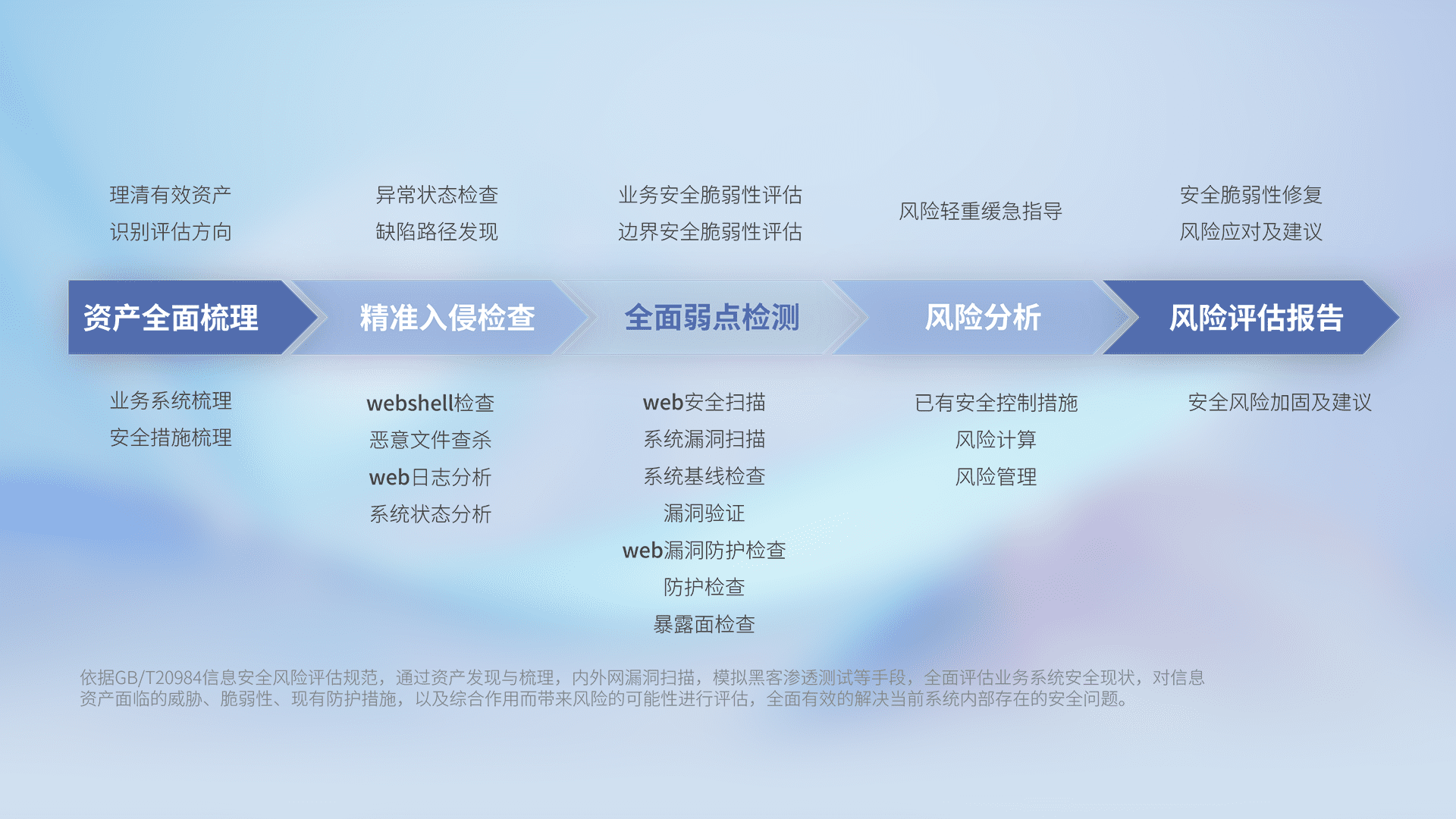 针对客户行业特性,,以专业的安全服务+多厂商联合解决方案提供专属的一站式安全管理服务,,帮助客户全面感知网络空间威胁,,基于识别、、、、检测、、分析、、、、防护、、、、监测、、响应的服务理论模型,,从方案咨询、、集成交付、、评估验证、、优化加固、、、、运维运营,,致力于为客户提供完整的闭环管理式安全服务。。。。以实战经验为客户打造高抵御风险的安全体系,,帮助客户发现威胁、、对抗威胁、、、、处置威胁,,,不断积累安全对抗能力,,,持续保障数字化安全。。。